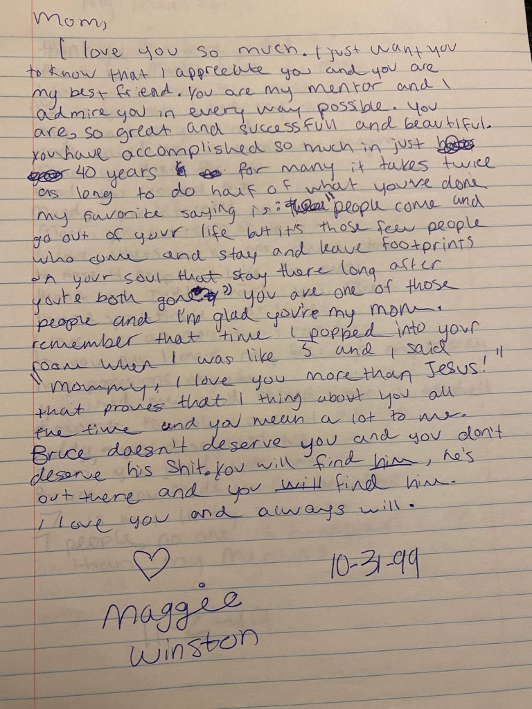 It made me feel like I could open up some more… so I text her these two journal entries tonight and then we talked on the phone. I told her that I was a really sad and fucked up little girl, and that I tried to tell her about it, and she wouldn’t hear me at that time. She apologized. I explained that I knew she was going through shit too, and that she didn’t have the capacity to help me… and I really didn’t need her to apologize, and I don’t I think she really meant it, or it wasn’t very sincere at least… but I did feel heard. That’s what I fucking needed. All in all, I got what I needed from her. Wow. How fucking cathartic.