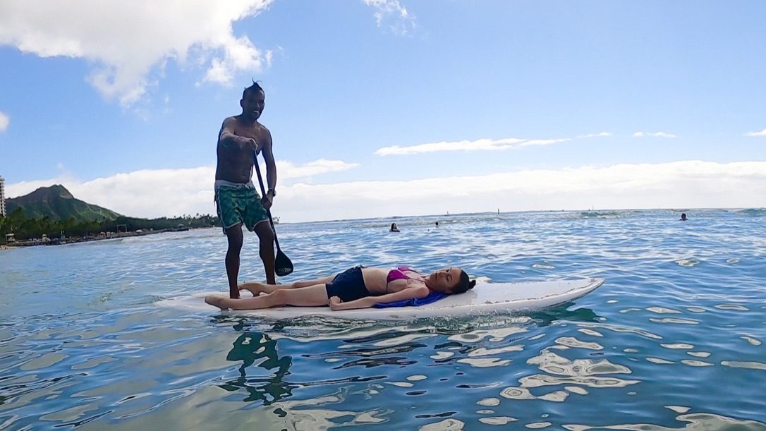 Suddenly I was gliding on top of the water. I’m laying flat on my back, so all I can really see is the beautiful blue sky and the strange Hawaiian man standing at the end of the board with a paddle, literally in control of my life. It was so incredibly serene. I didn’t feel scared, I just felt peace and blissful serenity. The warm sun does something magical to my body. And the combination of the warm sun and the cold salty ocean resemble this beautiful, natural yin and yang that feels almost primal. There are few times in life when you get to be as truly present as an experience like this forces you to be. I was literally soaking it all in.